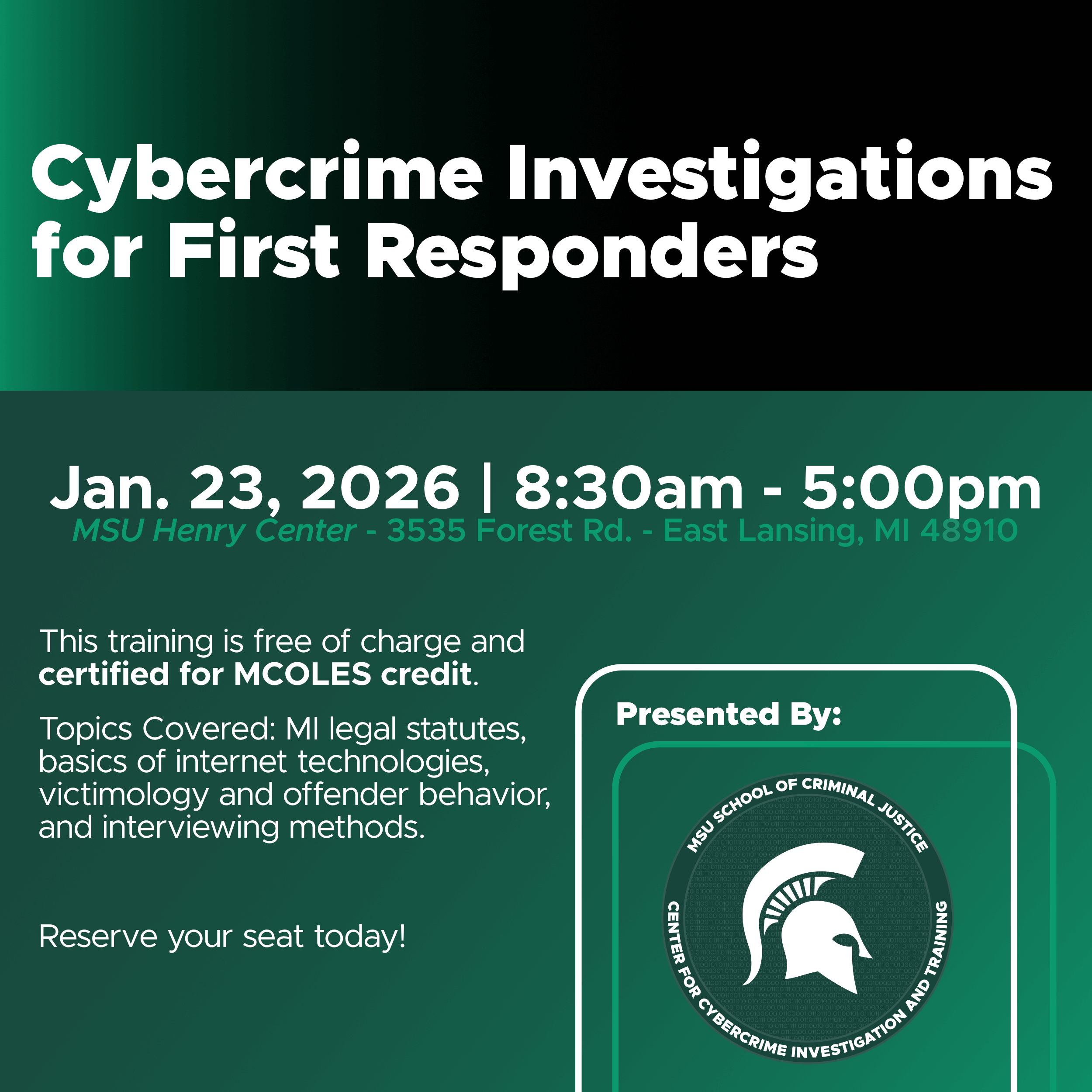 This training is approved for 8 hours of credit with MCOLES and is taught by cybercrime experts from the Michigan State University School of Criminal Justice.